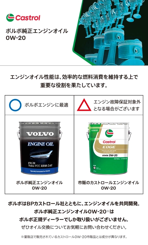 ボルボのために共同開発された、ボルボ純正エンジンオイル 0W-20 がおすすめです。